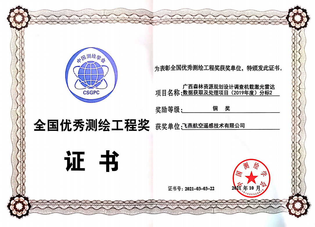 森林是人類的搖籃,發達的林業是國家富裕、社會文明的重要標志。飛燕遙感承接的“廣西森林資源規劃設計調查機載激光雷達數據獲取及處理項目(2019年度)分標2”助力廣西林業分析,摸清“家底”,榮獲2021年度全國優秀測繪工程獎銅獎。