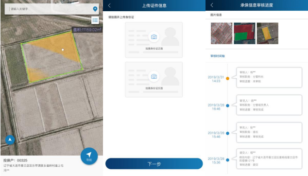 將傳統(tǒng)的承保模式改成在線承保。業(yè)務(wù)人員首先選擇地塊,自動獲取地塊對應(yīng)的農(nóng)戶信息、歷年承保情況,并且通過智能掃描技術(shù),進行身份證信息驗證、銀行卡信息識取,通過客戶端一鍵上傳承保信息,生成電子保單;審核人員獲取電子保單后在線調(diào)取影像資料、歷年情況、風險預(yù)測結(jié)果等信息輔助審核,既提高了工作效率,還增強了業(yè)務(wù)信息的準確性。