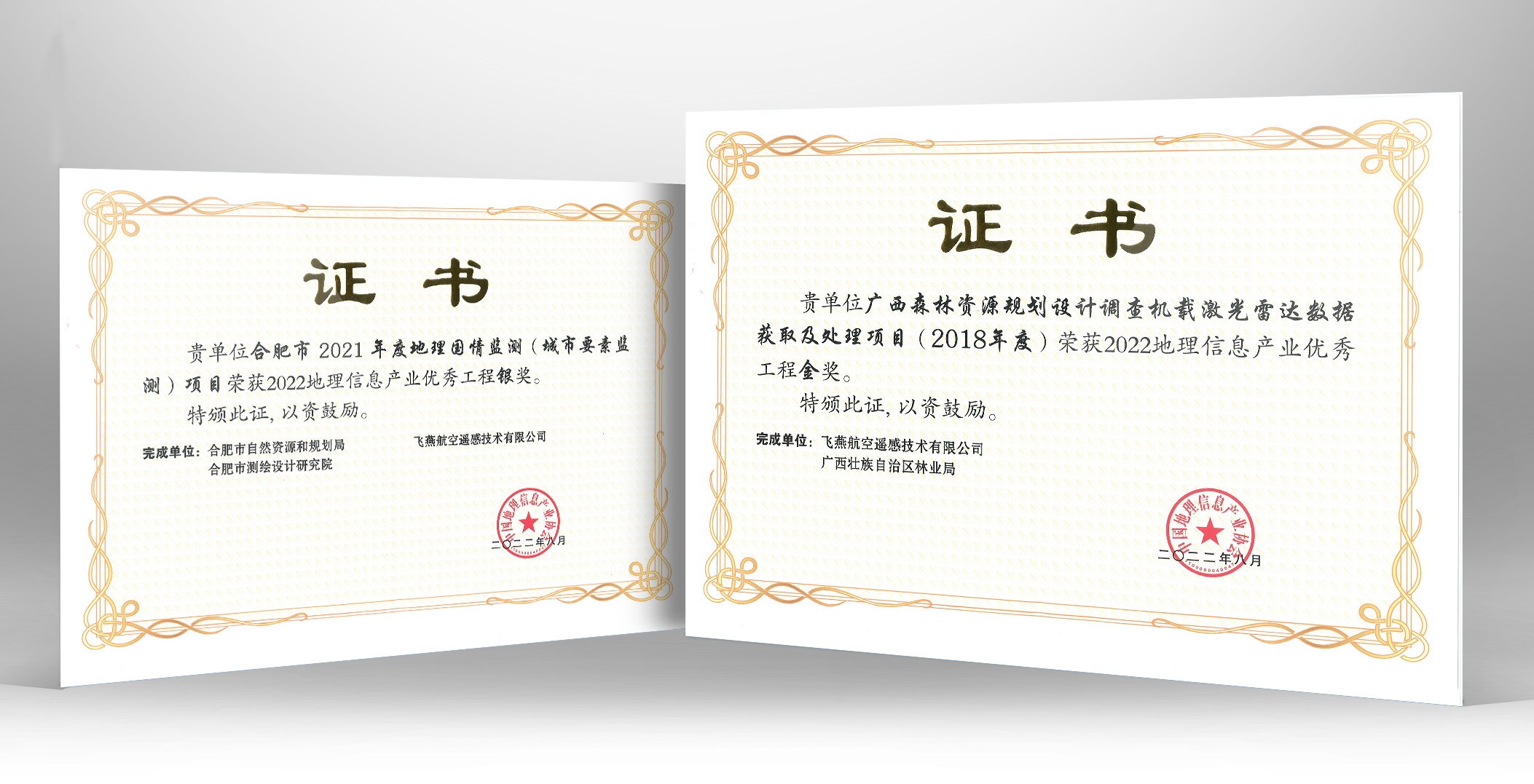 飛燕遙感憑借“廣西森林資源規劃設計調查機載激光雷達數據處理”和“合肥市地理國情監測”項目分別榮獲2022年地理信息產業優秀工程獎金獎和銀獎。