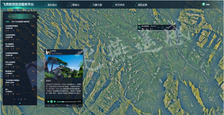三維智慧旅游平臺,基于景區實景三維模型和二維地圖,提供景區場景三維展示、推廣宣傳、資源管理、服務管理和景區救援等功能。