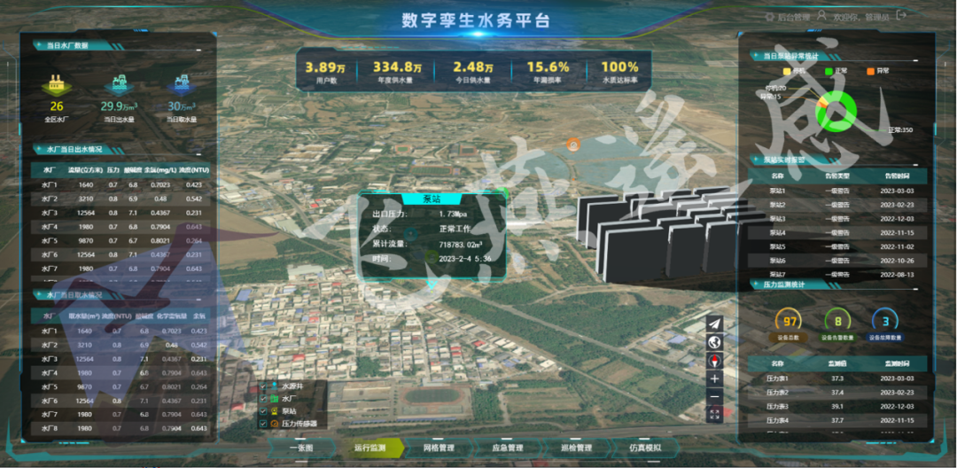 集成數(shù)字孿生技術(shù)、三維可視化技術(shù),通過建模渲染建立水務(wù)設(shè)施的結(jié)構(gòu)形狀和位置關(guān)系,實現(xiàn)物理對象的數(shù)字化表達(dá)。打通水務(wù)管理中各業(yè)務(wù)系統(tǒng)的數(shù)據(jù)孤島,實現(xiàn)水務(wù)工程的三維展示、全過程實時監(jiān)測、故障預(yù)警等,協(xié)助管理者一目了然地掌握業(yè)務(wù)趨勢,獲取數(shù)據(jù)使用價值,完成高效率管理、運營和決策。