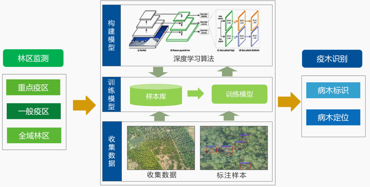 利用無人機、大飛機等監(jiān)測平臺采集林區(qū)數(shù)據(jù),依托自主研發(fā)識別AI算法,構(gòu)建人工智能數(shù)據(jù)樣本庫,覆蓋多時期、多樹種多脅迫等樣本數(shù)據(jù),以支撐高性能算法模型的訓(xùn)練和識別。