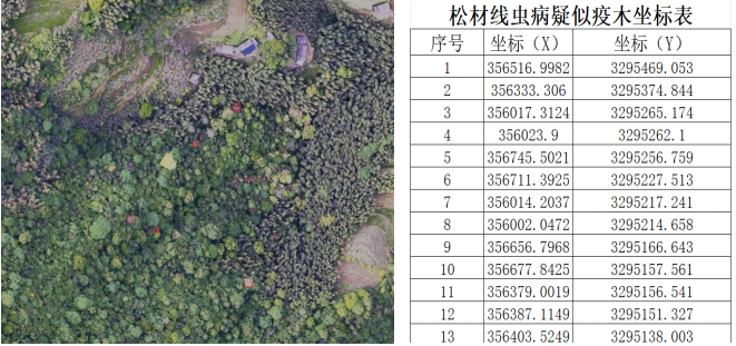 3.成果導(dǎo)出,AI松材線蟲病識別完成后生成帶標識成果圖和疑似疫木坐標表。