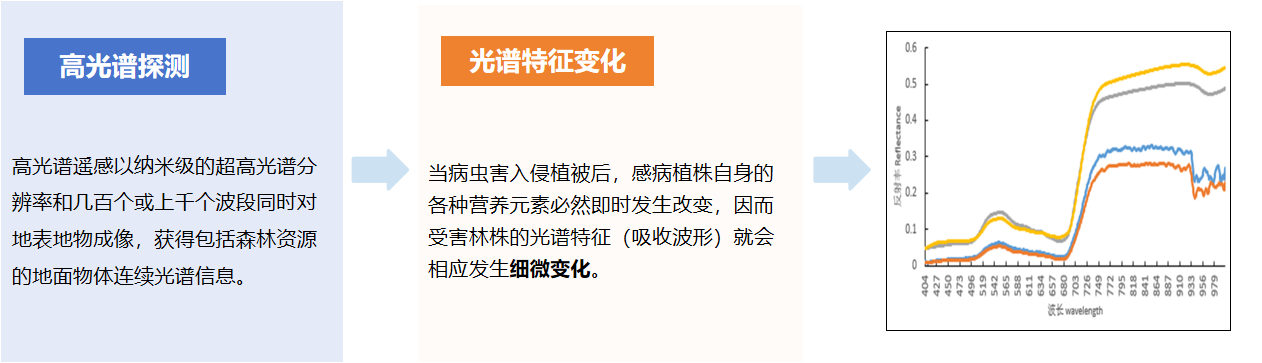 高光譜遙感以其強大的光譜敏感性(納米級的窄通道)能夠探測到植被在病蟲害侵害早期與健康植被的細微光譜差異,為森林病蟲害的早期監(jiān)測預(yù)警提供了可能。通過AIMS多模態(tài)航攝儀獲取高分辨率的影像數(shù)據(jù)、多光譜數(shù)據(jù)及點云數(shù)據(jù),時空同步的多源數(shù)據(jù)融合,結(jié)合機器學(xué)習(xí),利用林業(yè)領(lǐng)域的知識庫進行訓(xùn)練,可以做到單木級別的松材線蟲染病樹木的自動化提取。基于樣本調(diào)查、目視解譯、圖像識別、機器學(xué)習(xí)、深度學(xué)習(xí)等方法解決林業(yè)病蟲害方面的需求。