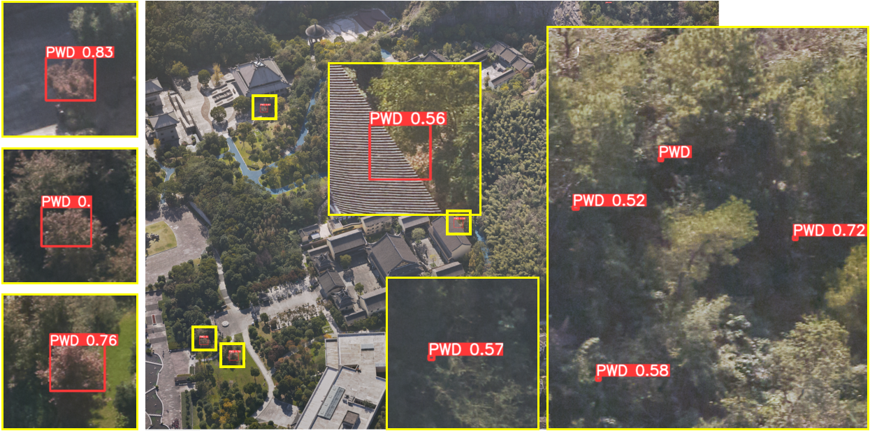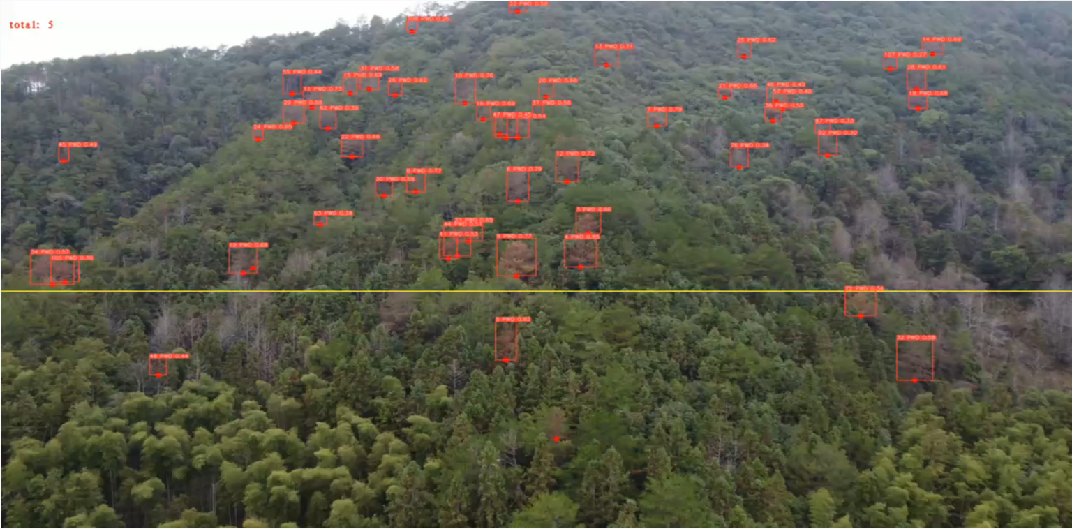 松材線蟲病死樹出現(xiàn)的高峰期在每年的8—10月份,一株松樹感染松材線蟲病最快40天左右就會死亡。飛燕遙感AI智能識別方案具有監(jiān)測速度快、識別準確率高、實施成本低的特點,能夠及時發(fā)現(xiàn)松樹異常情況,確保疫情早發(fā)現(xiàn)、早除治。