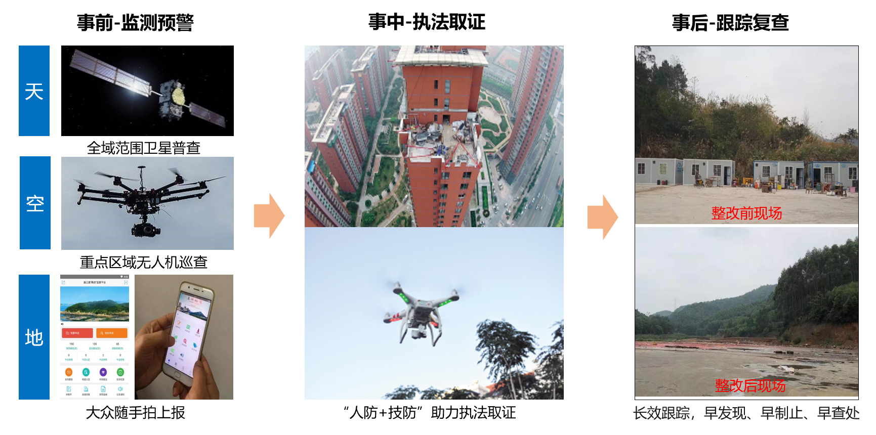 通過衛(wèi)星、無人機(jī)、APP等技術(shù)手段,打造衛(wèi)星影像監(jiān)測、高清航拍監(jiān)測和人工無縫巡查相結(jié)合方式,形成“地面上報(bào)、空中巡查、衛(wèi)星監(jiān)測”的“天羅地網(wǎng)”,實(shí)現(xiàn)事前監(jiān)測預(yù)警、事中執(zhí)法取證、事后跟蹤復(fù)查覆蓋業(yè)務(wù)全生命周期,讓“兩違”無處遁形,極大地提高違法建設(shè)的防控和查處效率。