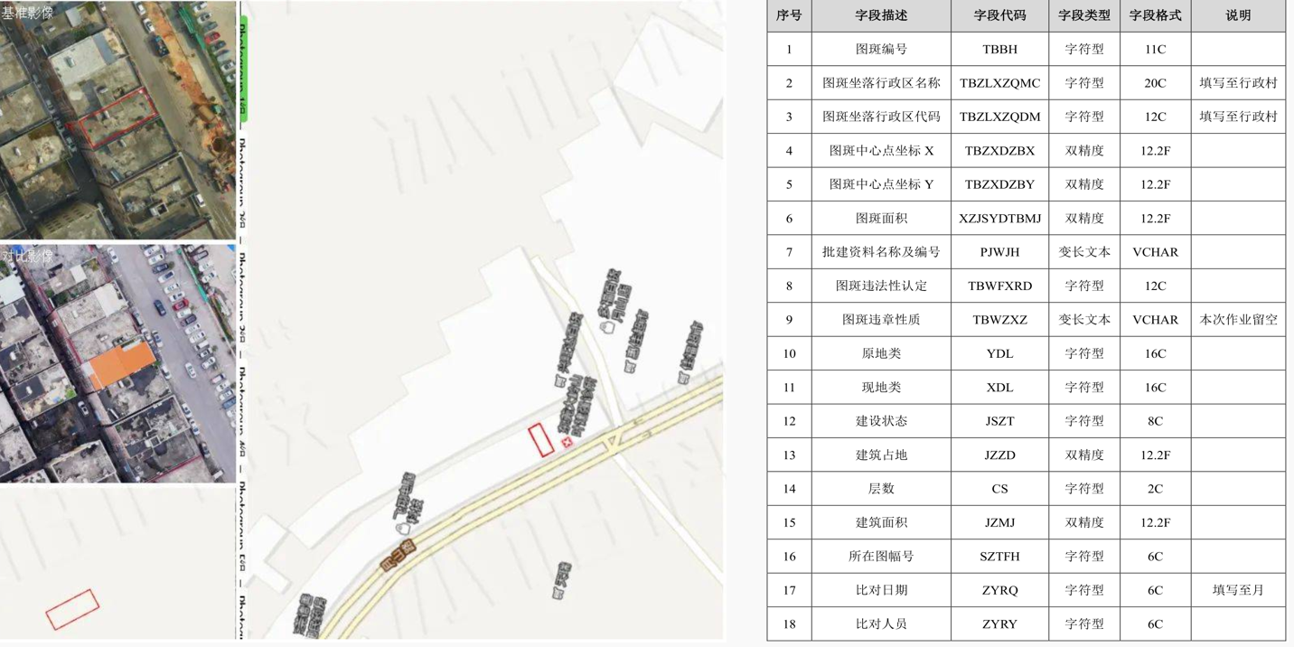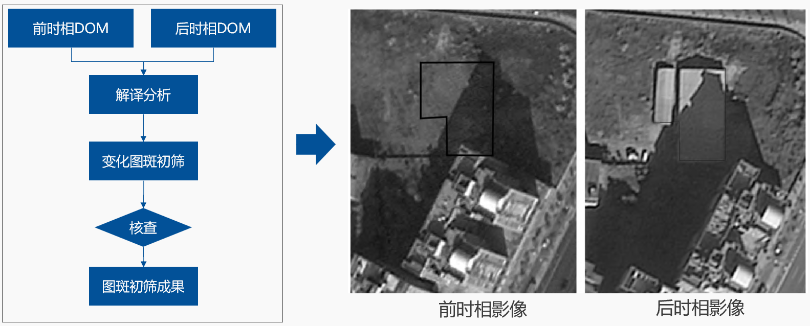 基于智能解譯中心平臺(tái),利用多期數(shù)字正射影像數(shù)據(jù)進(jìn)行變化監(jiān)測處理,檢測變化建設(shè)用地或違法建筑圖斑。逐塊逐片比對影像紋理,判讀變化圖斑,并逐一圈定疑似變化圖斑。