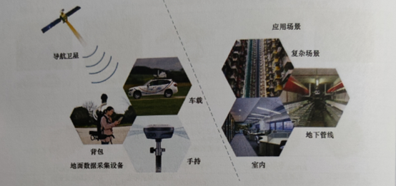 針對城市中復雜場景、室內(nèi)、地下管線等衛(wèi)星遙感以及航空攝影手段難以獲取數(shù)控的對象,可在地面進行數(shù)據(jù)采集,如圖 2-2 所示。實景三維地面數(shù)據(jù)采集主要有車載背包、手持等方式,通過將激光掃描儀、影像采集設備、定位定姿設備、同步控制器等多傳感器集成于一體,并根據(jù)采集需求將設備搭載在測量車上,對建筑、道路進行高精度實景三維數(shù)據(jù)采集,或通過背包、手持的方式對室內(nèi)室外、地下管線進行數(shù)據(jù)采集。