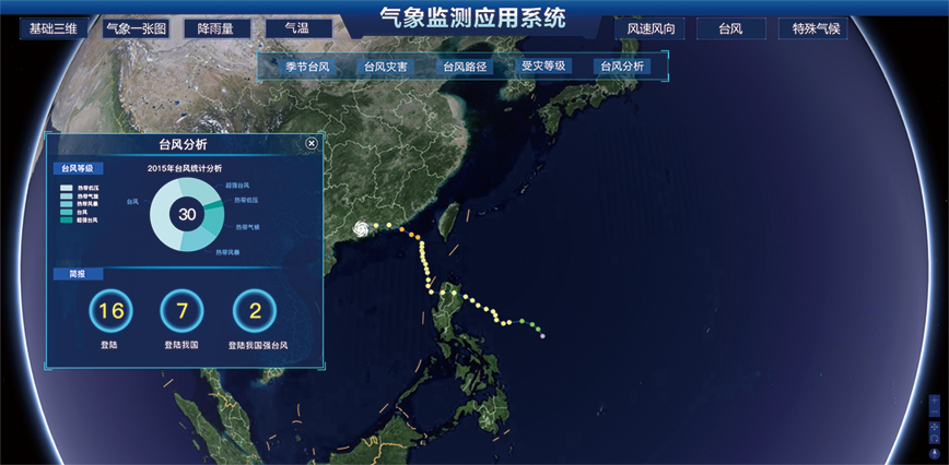 通過三維GIS技術,結合氣象部門發(fā)布的氣象數(shù)據(jù)、現(xiàn)有的區(qū)域內地形、河網(wǎng)等水文信息,構建水利氣象監(jiān)測系統(tǒng)。基于氣象因素動態(tài)分析,科學預測區(qū)域內水域、水利造成的影響范圍及影響程度。針對極端天氣,例如臺風,系統(tǒng)會錄入臺風的運動軌跡與時間信息,預測臺風登陸的時間地點,適時發(fā)出預警信息。
